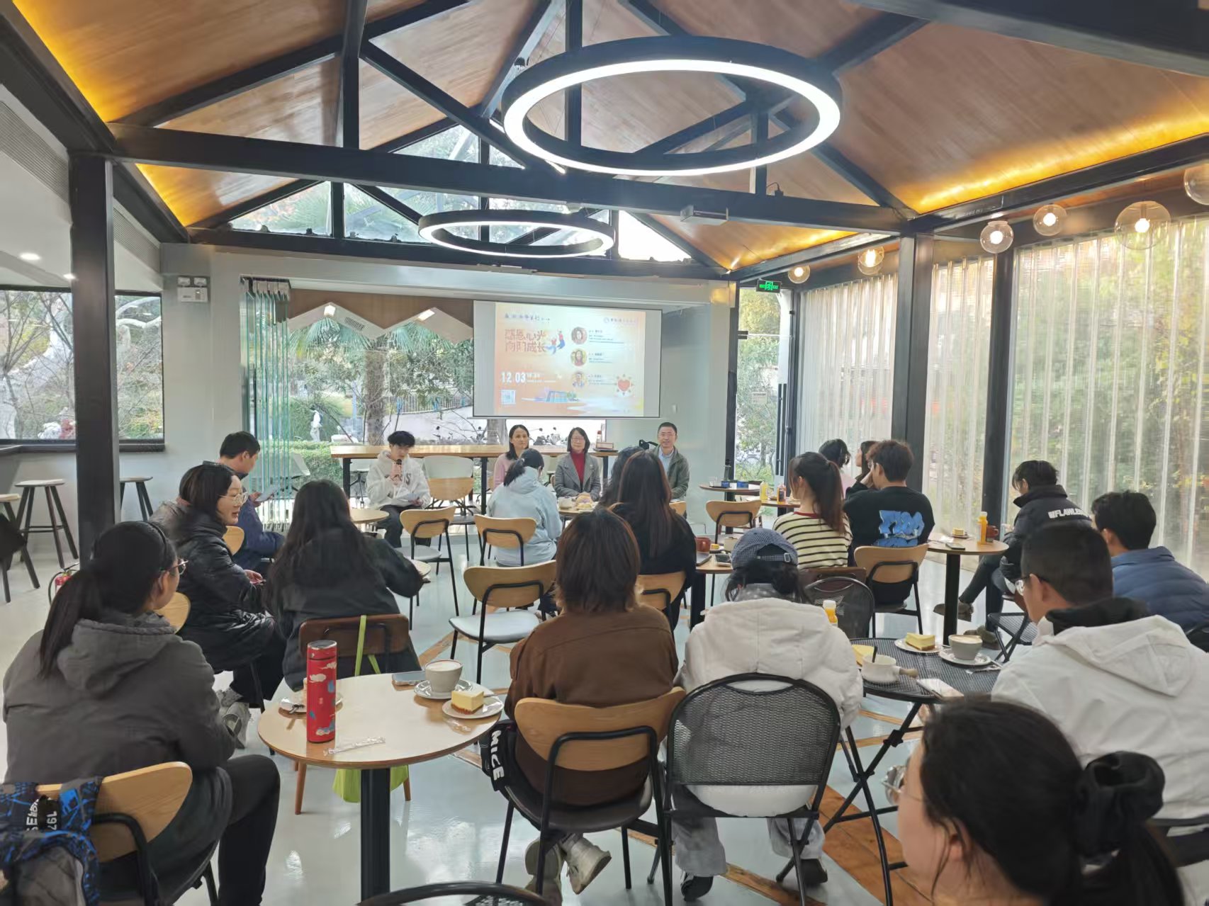 12月3日,第十七期“瀚海师生行”活动在中国科学技术大学东区1958咖啡厅举办。本期活动以“感恩心光,向阳成长”为主题,作为学校心理健康主题活动月系列活动之一,特邀夏红卫、宫晓梅、李春生三位在心理健康领域拥有丰富经验的嘉宾,与同学们展开了一场贴近心灵、启迪成长的对话。活动由少年班学院2023级2班心理委员、微笑心理协会副社长杨硕同学主持,吸引了来自各院系的师生积极参与。